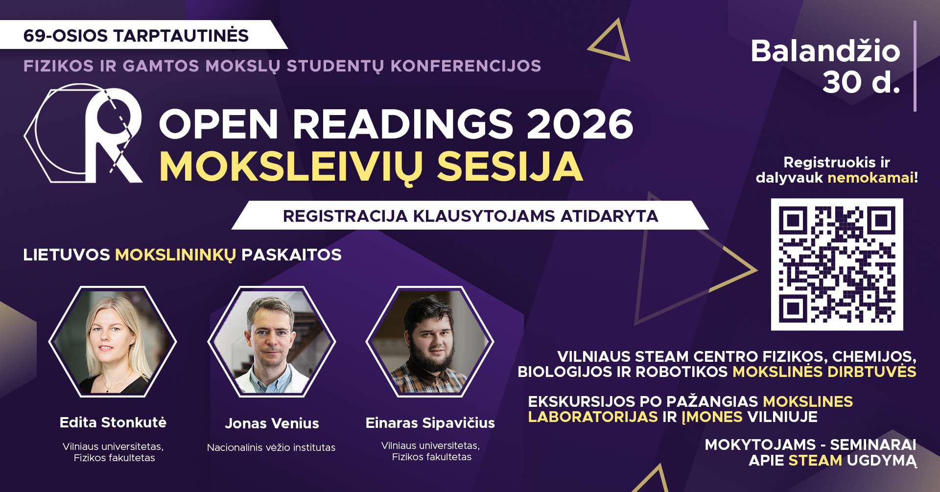 The 69th International Scientific Conference for Students of Physics and Natural Sciences gathers people to discuss, learn, exchange and share their scientific experience, meet key experts and enjoy an exciting programme. The conference includes lectures of well-known, leading and accomplished scientists and presentations of students’ research. “Open Readings 2026” gives an opportunity for BSc, MSc and PhD students who are doing their scientific research, to present it to a larger audience, get constructive criticism and useful advice.
